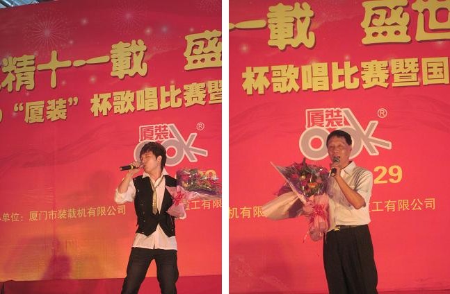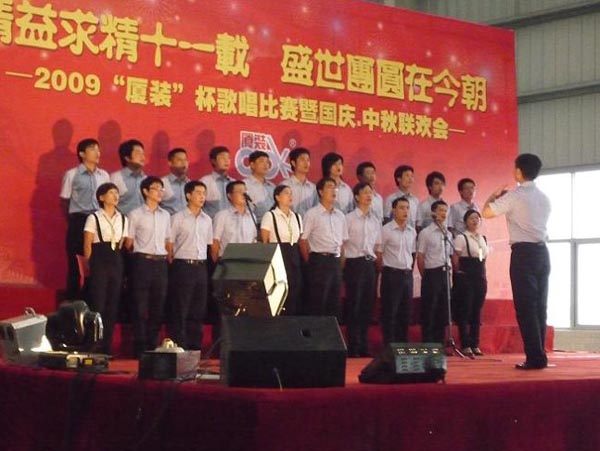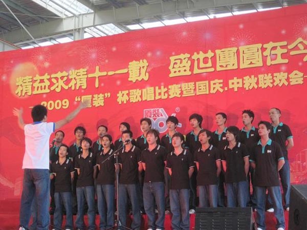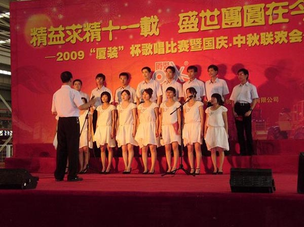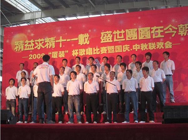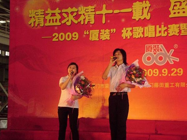 9月29日下午,2009年度“廈裝杯”歌唱比賽在廈裝公司總裝車間舉行。此次歌唱比賽以“精益求精十一載、盛世團圓在今朝”為主題,賀祖國60周年華誕、喜迎中秋、慶祝廈裝成立11周年。公司及各部門從6月份開始籌備此次比賽,此次比賽分為集體組和個人組,集體組(合唱)以部門為單位,最終有6支隊進入當天的決賽,個人組通過先前的部門推薦及預(yù)賽選拔,最終有11人闖入決賽。